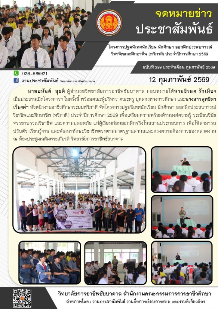 โครงการปฐมนิเทศนักเรียน นักศึกษา ออกฝึกประสบการณ์วิชาชีพและฝึกอาชีพ (ทวิภาคี) ประจำปีการศึกษา 2569 ณ ห้องประชุมเฉลิมพระเกียรติ วิทยาลัยการอาชีพชัยบาดาล